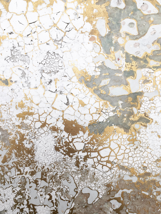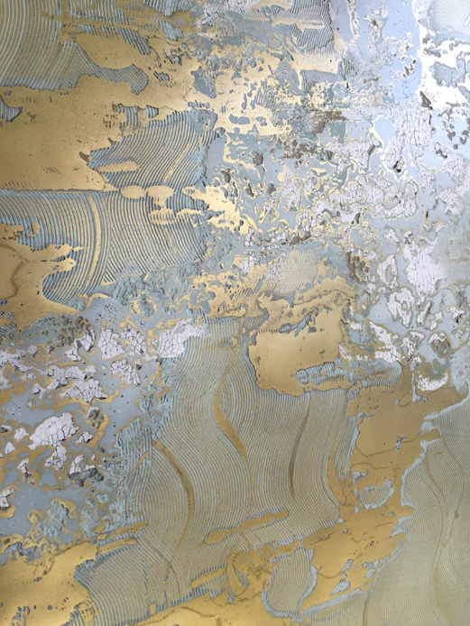 In response to an invitation from Galerie Marcilhac, we created a grand decor consisting of 12 panels featuring celadon scagliola and cracked patterns with brass clouds and waves.
