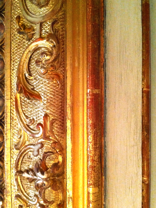 L’accent a été mis sur la patine à l’endroit des moulures en demi rond, peintes en rouge sang de bœuf. Nous avons nettoyé les ors, recréé les sculptures, redoré les réparations à la feuille et patiné la dorure.