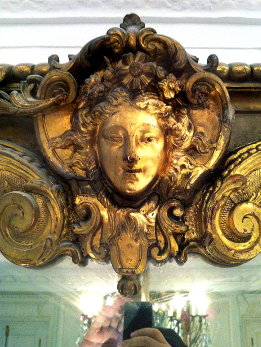 Special emphasis was placed on patination for the half-round moldings, painted in ox-blood red. The gold elements were cleaned, the sculptures recreated, repairs regilded with gold leaf, and the gilding patinated to restore their original splendor.