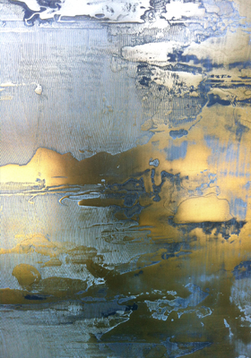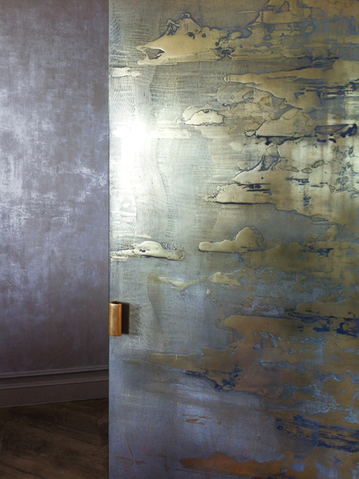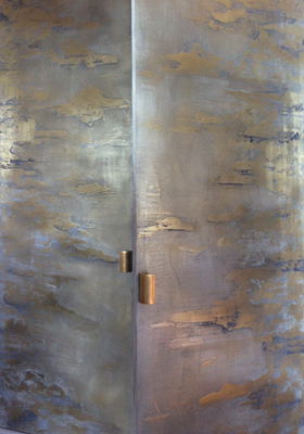 Lacquer and Brass - Double decorative doors for a custom-made bar, with an exterior made of oxidized brass with white patina, and the interior and drawers finished in high-gloss two-tone lacquer with a violet travertine pattern.