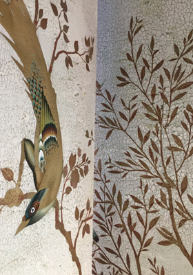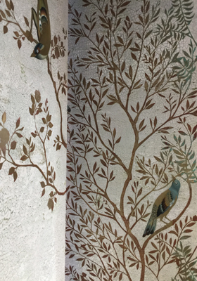 A garden landscape in Chinese style featuring motifs of trees and birds repainted on subtle brass and copper bas-reliefs. The background is contemporary gray/white scagliola with cracks and accents of brass and copper lines.