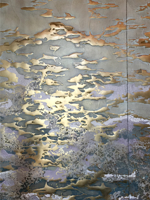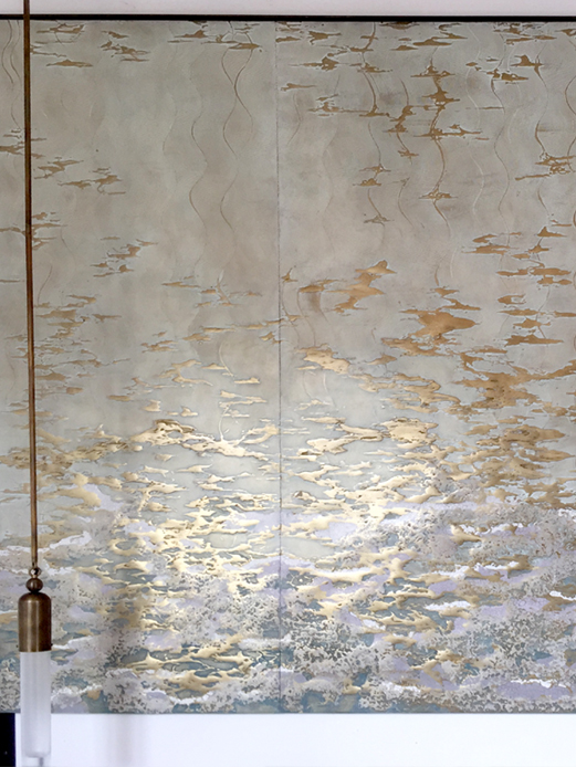 Decor with mauve and cracked scagliola on a wavy brass background.
