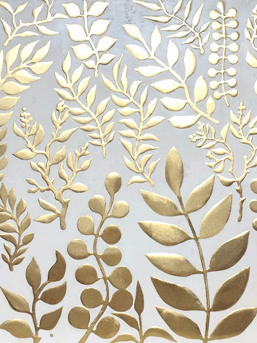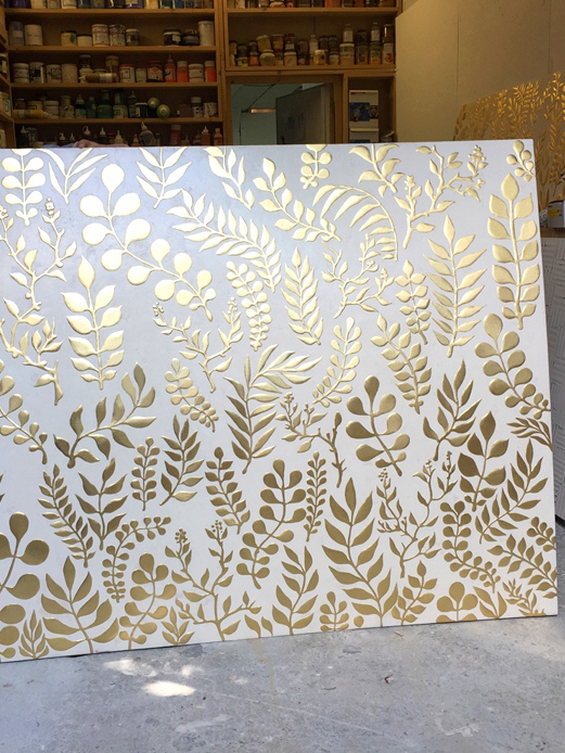 Ensemble de décors grands végétaux en bas-reliefs et dorure sur stucco ivoire.