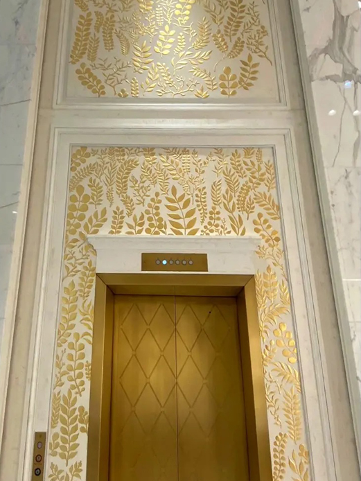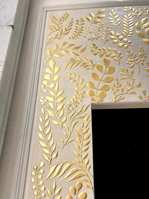 A collection of large bas-relief botanical decor pieces with gilding on ivory stucco, serving as door frame embellishments.