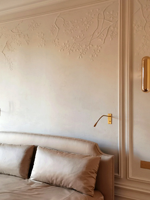 Poplar branches in bas-relief against a slightly undulating background, evoking the ambiance of a Japanese garden or the nearby Seine River.