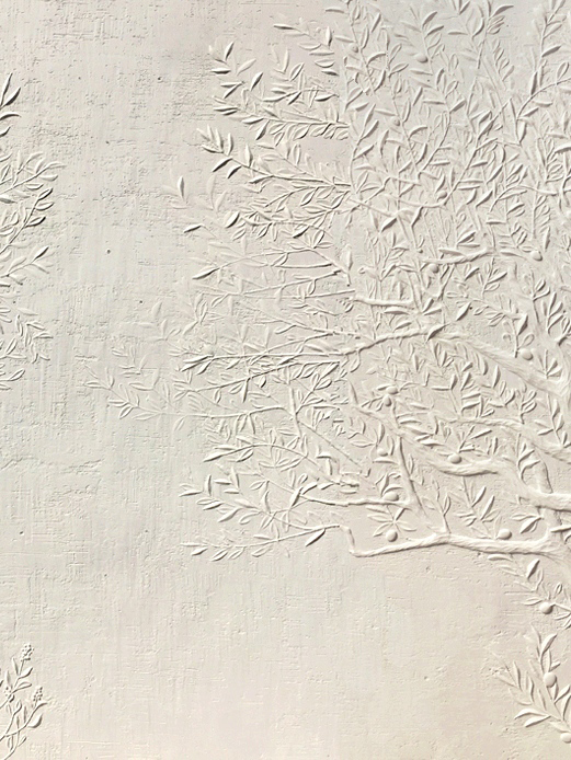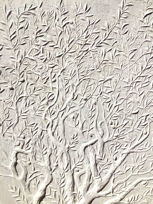 A plaster bas-relief panorama adorned with olive trees for a kitchen/dining area.