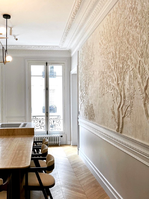 Un panoramique planté d’oliviers, bas-relief de plâtre, pour une cuisine/salle à manger.