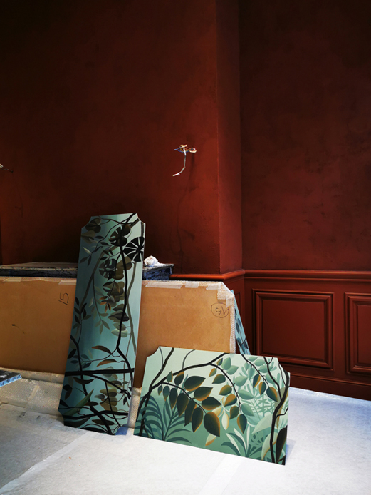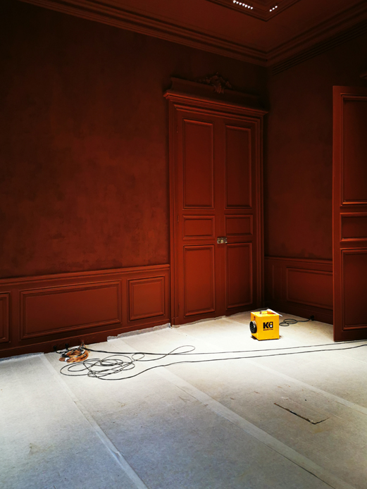Bibliothèque à l’ambiance théâtrale avec cet enduit rouge à la manière des murs antiques.