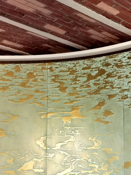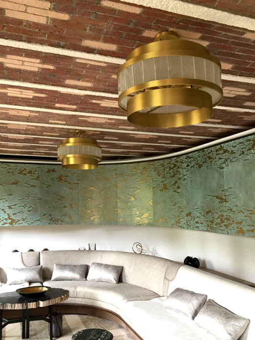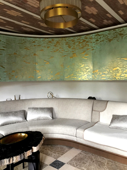The light from a long brass and cerulean blue cloud panorama for a small lounge in a private mansion.