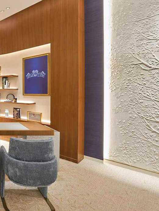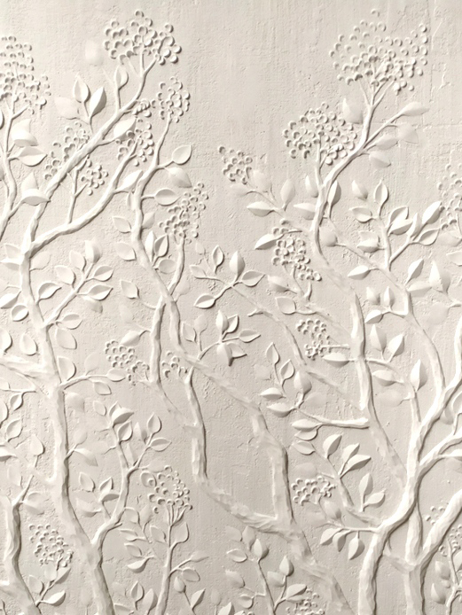 Un panneau décoratif d’arbuste romantique en bas-relief sur fond légèrement matièré.