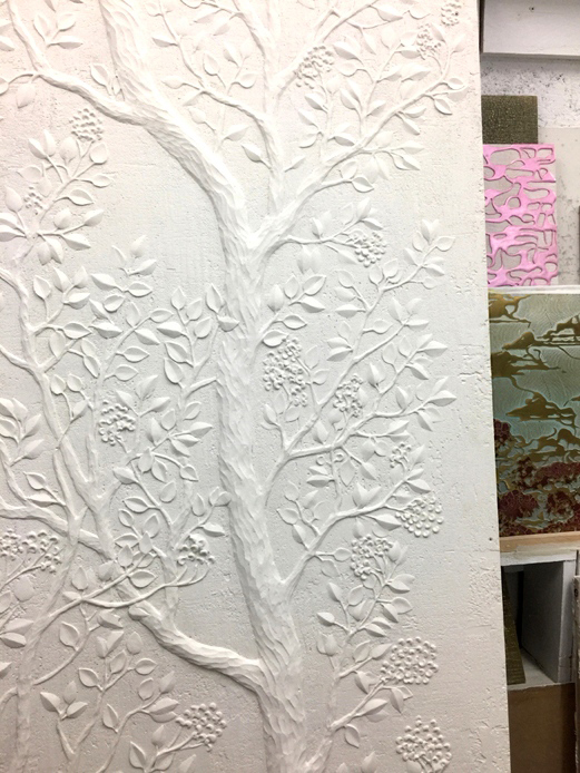 A decorative panel of a romantic bush in bas-relief against a subtly textured background.