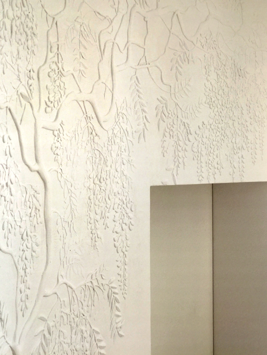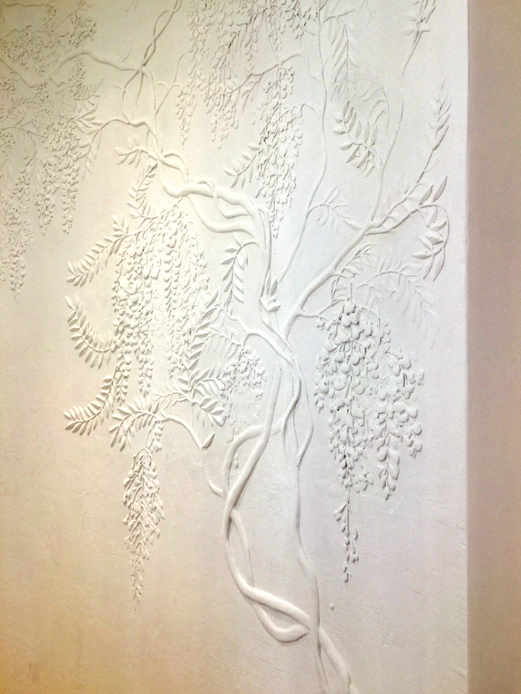 Deux glycines en mouvement, bas-relief de plâtre, de part et d’autres d’une pièce en rotonde.