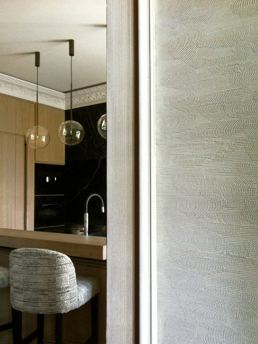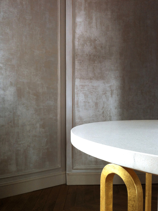 Création et réalisation sur les murs du salon d’un décor façon velours de soie moirée, montants et traverses en imitation de toile.