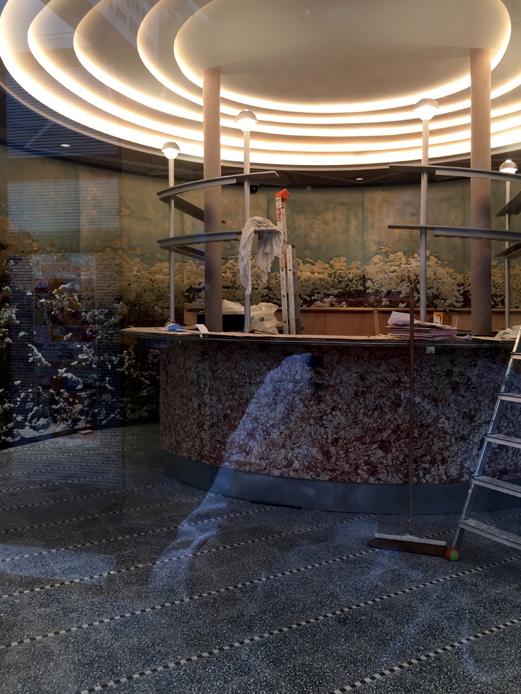 Commande sur mesure d’un grand panorama courbé en scagliola contemporain et motifs de craquelé et kintsugi.