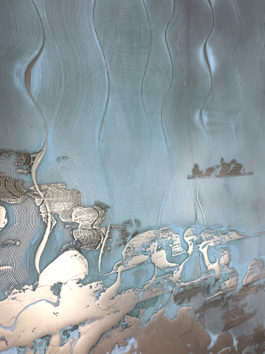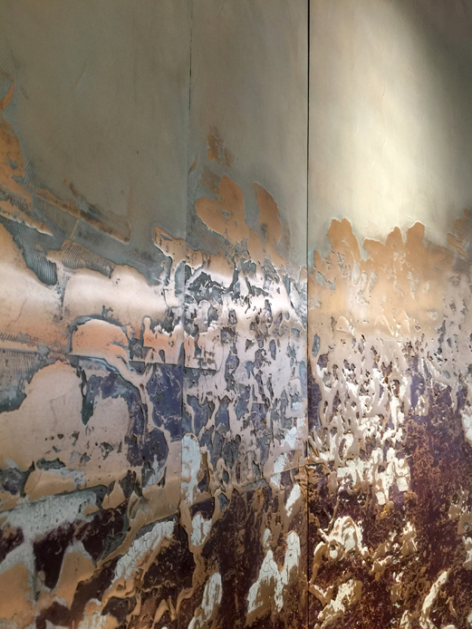 A custom-made large, curved contemporary scagliola panorama with cracked and kintsugi patterns in brass.
