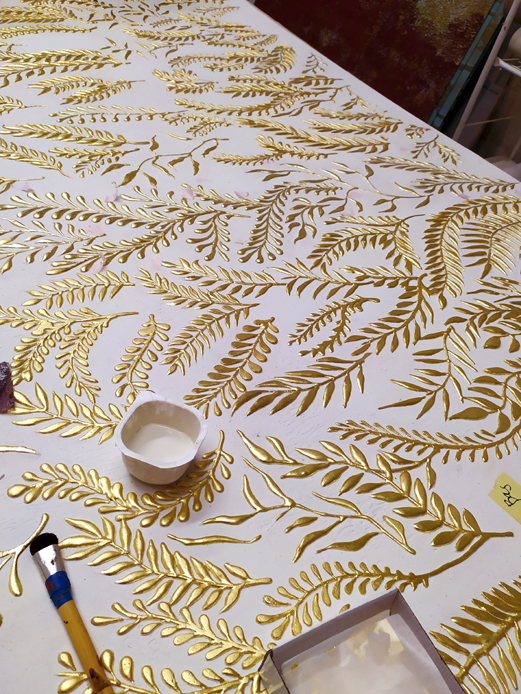 Décor courbe en bas relief de 80 végétaux dorés à la feuille.