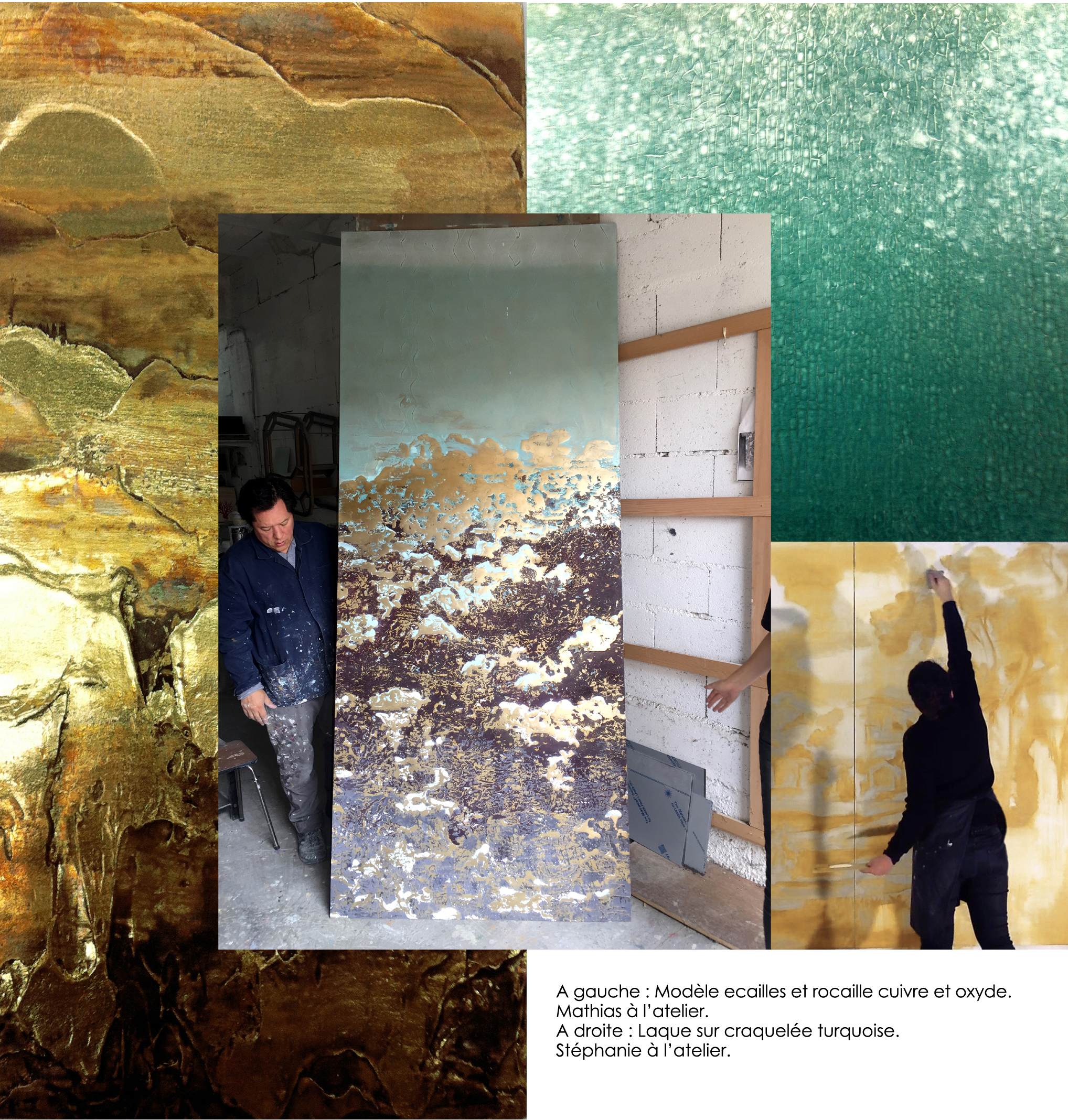 L'Étoile workshop specializes in creation. We create and handcraft decorative panels, interior decor, and wallpapers for individuals, architects, and decorators in France and abroad. Our decors are bespoke. Our processes, materials, and varnishes are of high quality and chosen to withstand the test of time and use. The workshop is led by Mathias Gaillaguet and Stéphanie Lay.